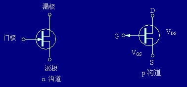 (b) JFET的符号 图1  JFET的概念图、符号      图1(b)门极的箭头指向为p指向 n方向,分别表示内向为n沟道JFET,外向为p沟道JFET。图1(a)表示n沟道JFET的特性例。以此图为基础看看JFET的电气特性的特点。