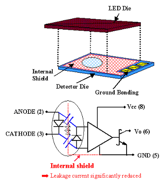 |   | IEC 60747-5-2 | EN 60747-5-2 | 1577 | 元器件验收五号通告 | DIN EN 60747-5-2 |      表3: 光电隔离器元器件级规范  对光电耦合器,目前最相关的元器件级标准是IEC/EN/DIN EN 60747-5-2。VDE 0884曾是光电耦合器的全球主导标准,直到2004年1月被IEC/EN/DIN EN 60747-5-2所代替。IEC/EN/DIN EN 60747-5-2规定了安全相关参数,如隔离电压(最大隔离电压和工作隔离电压)、间隙和漏电距离及其它与光电耦合器有关的其它参数。欧洲规范管理局(EN)和相关的国家管理机构(如德国DKE/VDE)在新标准中都遵守IEC。   如需与影响光电耦合器的规范有关的更详细的信息,请参阅安捷伦光学耦合器设计人员指南。可以从下述网址下载Adobe Acrobat格式的文件:www.agilent.com/view/optocouplerguide。   尽管可以通过各种技术实现功能隔离或电平移动,如高压集成电路(HVIC),但在最高技术指标中被视为十分安全的加强隔离只能通过合格的脉冲变压器和光电耦合器实现。磁性隔离器或磁性耦合器等新兴技术目前只能视为提供了功能隔离,因为还没与其相关的全球公认的标准。设计人员需要知道其最终产品要求什么样的隔离质量,并选择适当的技术满足这些要求。   通过IEC/EN/DIN EN 60747-5-2测试的任何光电耦合器都经过加强隔离认证,因此在对安全至关重要的应用中可以作为合格的隔离器使用。最大隔离电压与封装尺寸(内部和外部间隙、漏电)、耐高压的介电隔离能力及模封装化合物特点(相对轨迹隔阻指数或CTI)有关。此外,光电耦合器件标准得到了各种设备级标准的认可,这也有助于检定设备质量。     共模抑制 (CMR)   电路设计人员经常遇到共模噪声的负面效应。CMR故障与高压瞬变有关,其由于寄生电容而导致泄漏电流越过隔离边界。光电耦合器的寄生电容非常低,一般不到1 pF,而脉冲变压器常见的寄生电容则为40 pF以上。   泄漏电流与寄生电容成正比,其可能会非常大。转换斜率为10 kV/μs的瞬变电压会导致大约7 mA的泄漏电流,比光电二极管的电流要高1000多倍。基于这一原因,7 mA可能会干扰光电二极管的功能,光电二极管基本上是一个高增益跨导倒数放大器.   因此,设计人员使用屏蔽技术,最大限度地降低泄漏电流,使剩余的泄漏电流从输出IC的关键节点分流出去,特别是光电探测器区域。光电耦合器的屏蔽性能对整体抗CMR能力至关重要。安捷伦采用专有屏蔽技术,提供了高达15 kV/μs的CMR性能 (图1)。通过优化输入电路,如把LED偏置电阻器分开,使用不要求上拉电阻器的低阻抗输出阶段,可以进一步改善性能。      图示内容:   图1: 安捷伦的屏蔽技术明显降低了输入引脚和探测输出集成电路之间的寄生电容。